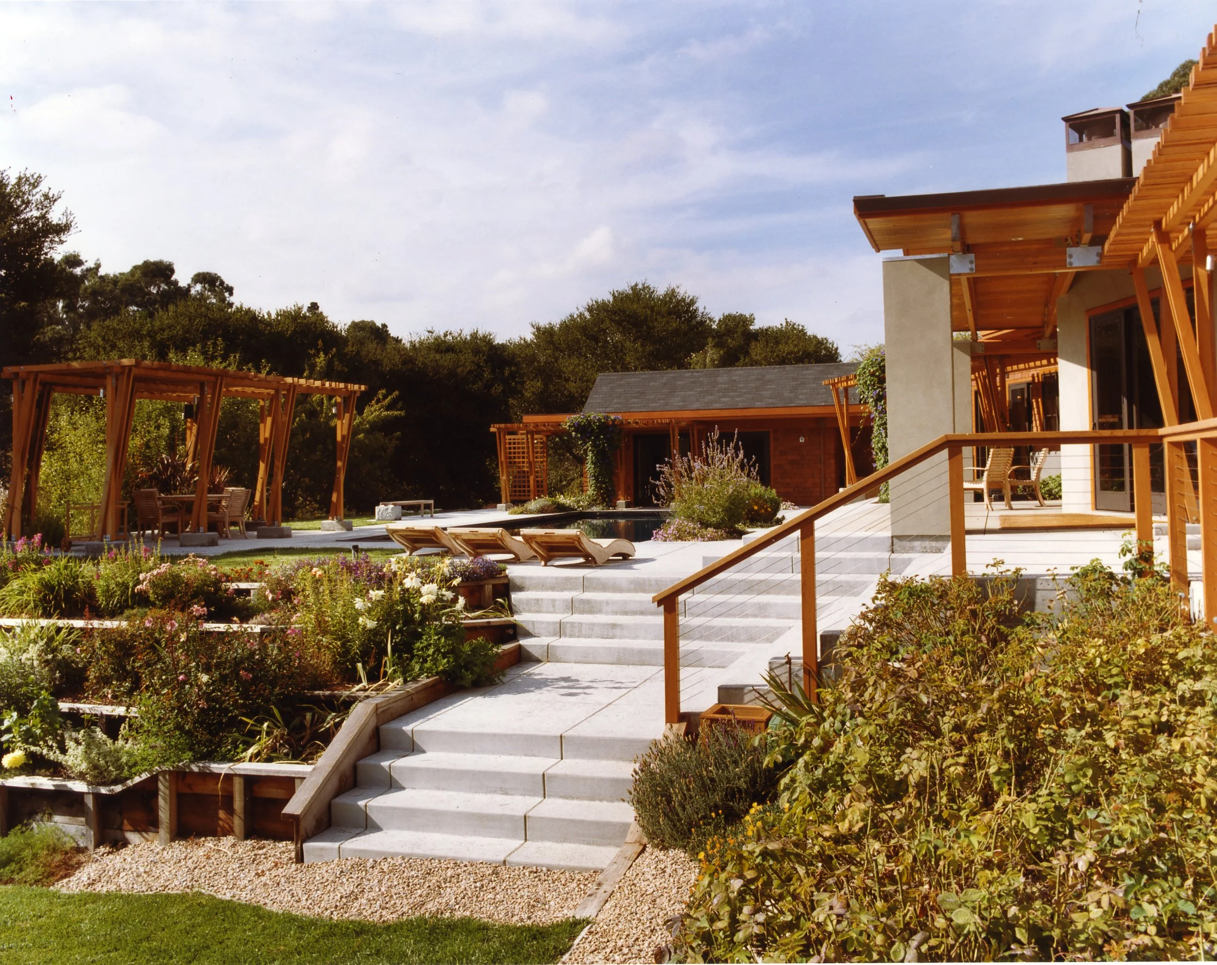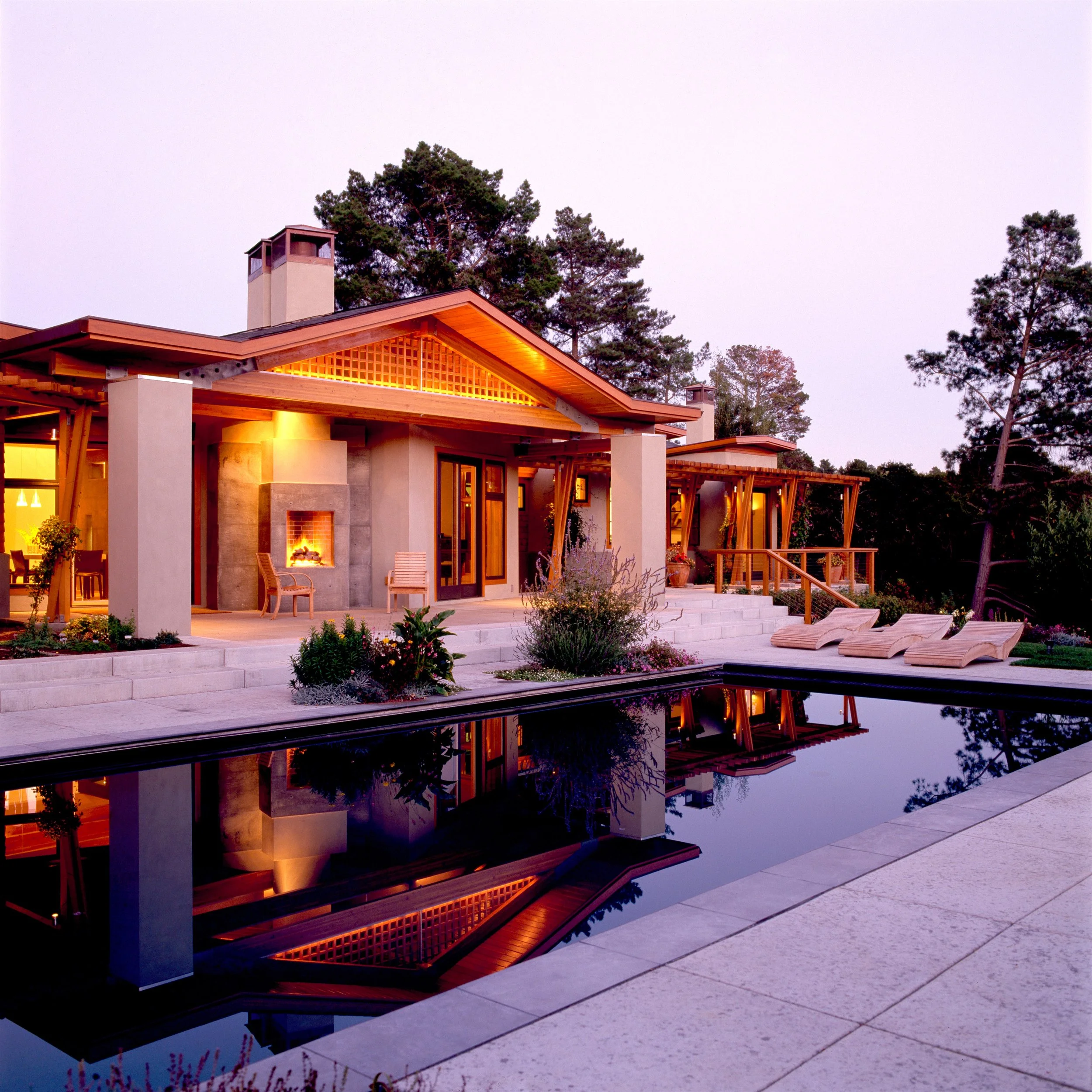 A primary design objective was to open up the home to the remodeled pool and new gardens surrounding it, blurring the distinction between inside and out. Generously sized, clear stained wood windows let in the views. New porches, patios, and cedar trellis provide a variety of outdoor living areas. Throughout the home, the use of sensuous natural materials and careful detailing allows the owners to enjoy the art of living well.